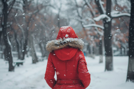Amidst a gentle snowfall, a person dressed in a vibrant red coat strolls through a serene park. The trees stand still, adorned with a blanket of snow, creating a tranquil winter atmosphere.
