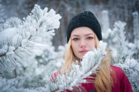 Beautiful girl in winter forest. Young woman in the winter forest