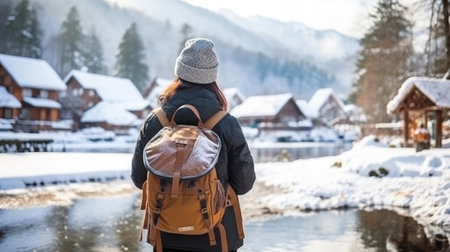 Young woman traveler looking at the beautiful UNESCO heritage village in the snow in winter at Shirakawa-go, Japan in twilight time