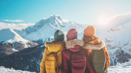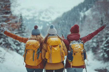 Three female hikers with backpacks enjoying snowy mountain scenery during winter trek