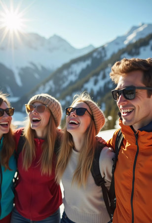 Friends gather in the snow, smiling and laughing while posing for a selfie. The bright sun shines over the scenic mountain landscape, creating a joyful atmosphere during ski trip. Generative AI.