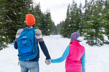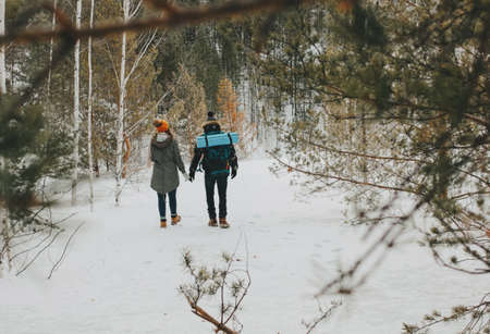 Couple Holding Hands Walking Snow Forest Outdoor Winter Back Rear View Pine Woods