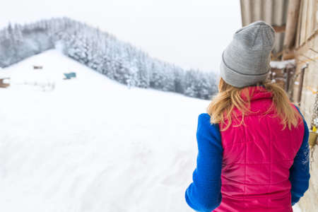 Rear view of a girl in a hat looking at a beautiful winter landscape.