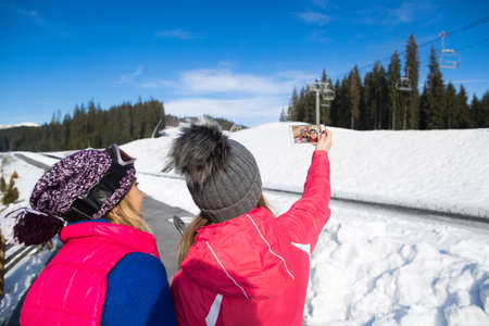Two Girls Tourist Snowboard And Ski Resort Snow Winter Mountain Two Woman Taking Selfie Photo On Cell Smart Phone