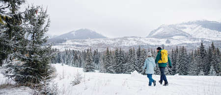 Rear view of father with small daughter on a walk outdoors in winter nature, Tatra mountains Slovakia.