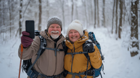 Happy couple taking selfie on snowy forest hike. generated by ai