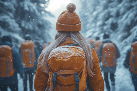 A group of hikers, dressed in matching orange backpacks and hats, traverse through a snow-covered forest. the scene highlights the winter wonderland atmosphere, showcasing the beauty of outdoor adventure and teamwork. Generative AI