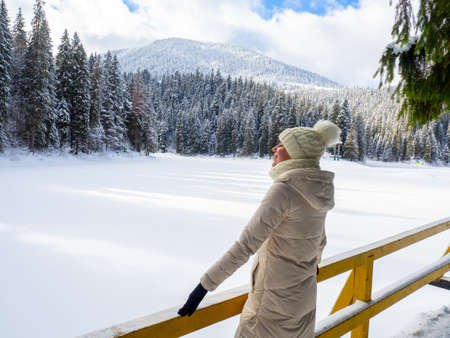 Woman in white clothes enjoying frozen lake Synevyr and forest in the Carpathian mountains. Winter lake among the snow-covered woods. Beautiful landscapes with coniferous forest on a bright sunny day.
