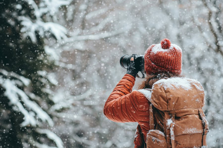 Winter travelling concept - back view woman taking picture of winter forest by smartphone