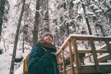 Portrait of a bearded photographer with a reflex camera in his hands in the winter coniferous forest. Photo travel concept