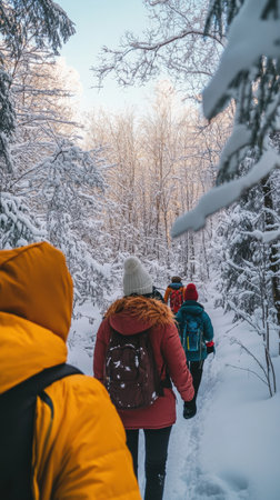 A group of friends dressed in colorful jackets hikes through a snowy forest, breathing in the fresh air while taking photos of the stunning winter landscape.