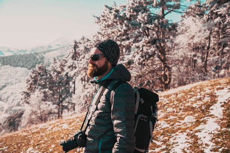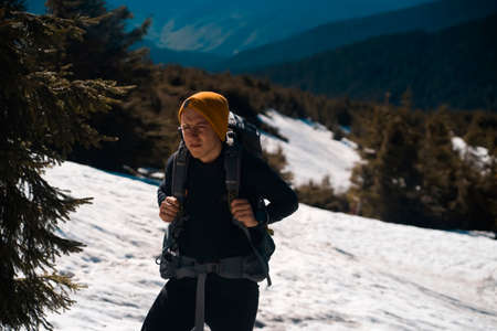 Smiling and happy traveler with hiking backpack on his back. Snowy forest and rocks. Climbing the mountain in winter. Survival in the wild. High quality photo