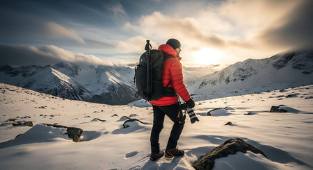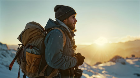 Hiker with backpack on the top of a snowy mountain at sunset