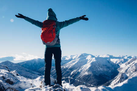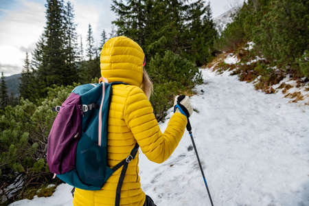 Female backpacker with backpack dressed warm down jacket enjoying snowy mountains landscape while she trekking winter mountain forest route. Active people in the nature concept image.