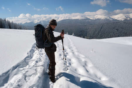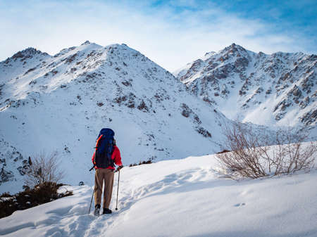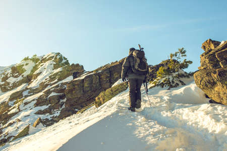 A man with a backpack travels in the mountains in winter. Beautiful sunny winter day