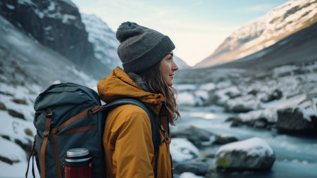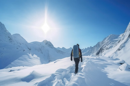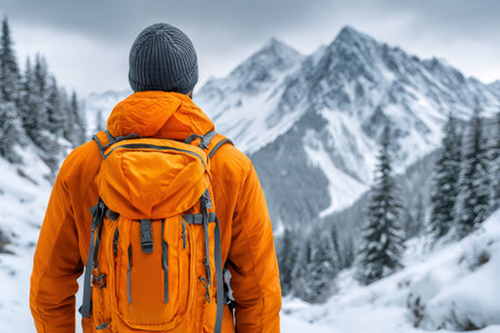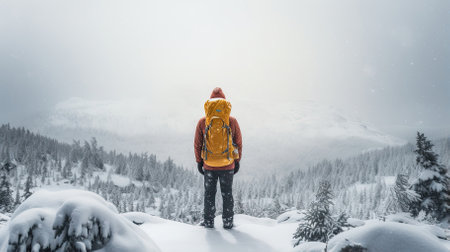 Generative AI, backpacker in winter landscape, traveler man tourist with backpack hiking in mountains