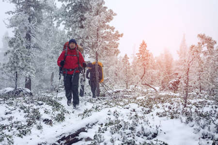 A small group of tourists traveling through the snowy woods in winter cloudy day. Tourists walking through the winter forest. Go through the trees