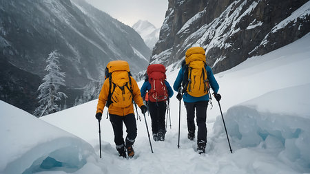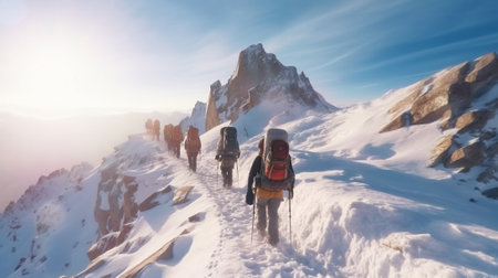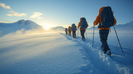 Hikers trekking through snowy landscape at sunrise in a remote mountain region on a winter morning. Generative AI