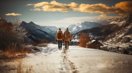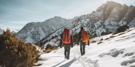 Eco travel and responsible tourism. Couple hiking in mountains in winter, rear view. AI Generated