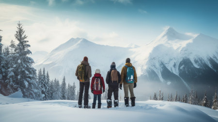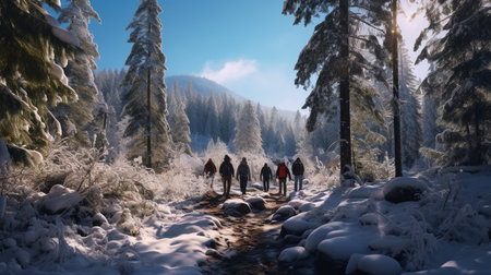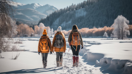 Group of people hiking in winter mountains with snowshoes and backpacks with AI generated.
