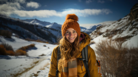 A joyful young woman in a yellow jacket and orange beanie smiles warmly, hiking in a beautiful snowy mountain landscape during winter.