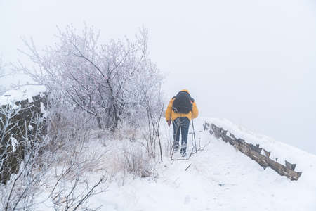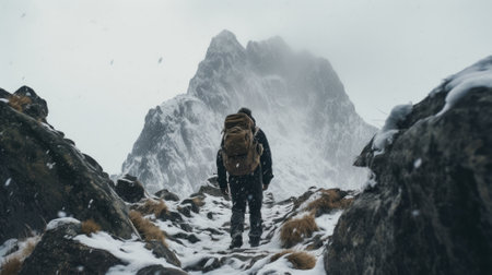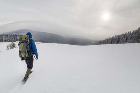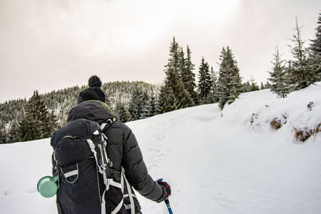 Man backpacker hiking snowy mountain hillside on cold winter day.