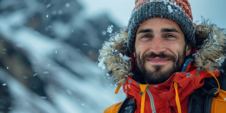 portrait of handsome man trekking in mountains in winter outdoor adventure active lifestyle and social distancing space for your text