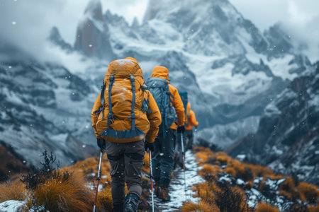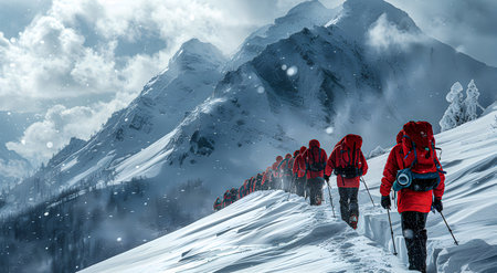 An active group of hikers ascending a snow-covered mountain, showing determination and teamwork against a challenging backdrop.