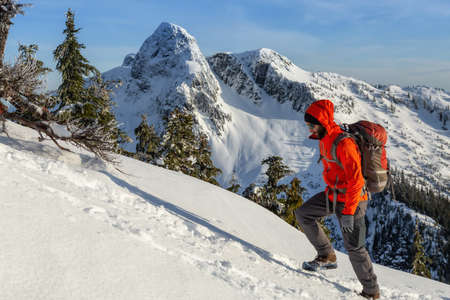 Adventure seeking man is hiking to the top of a mountain during a sunny winter evening. Taken in Mnt Harvey, North of Vancouver, BC, Canada.