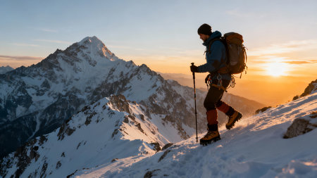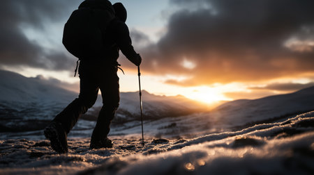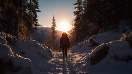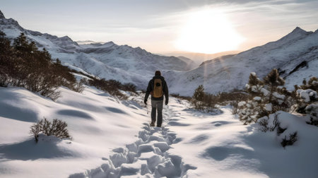 A lone hiker walks a snowy mountain path at sunset. Serenity and adventure in the vast winter landscape.