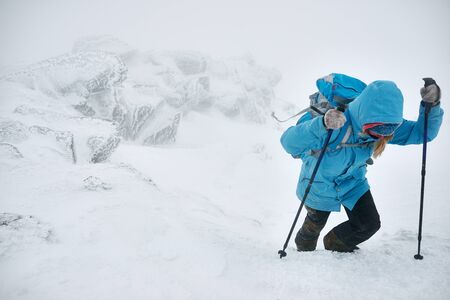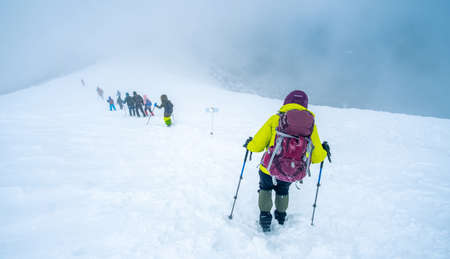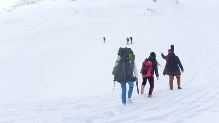 A group of people rear view making an extreme ascent to the top of the mountain in bad weather conditions, climbers in the mountains in a snowstorm.