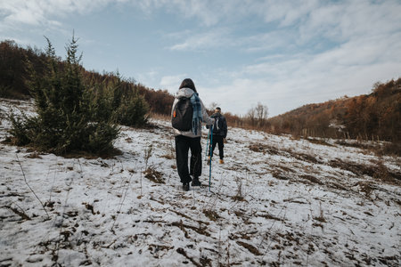 Two young hikers walking in a picturesque snowy landscape during winter