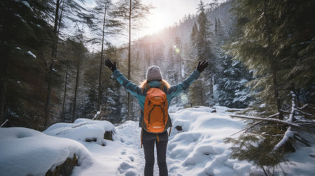 Female hiker, full body, view from behind, standing in a snowy forest with raised arms, hands clenched into fist - Generative AI