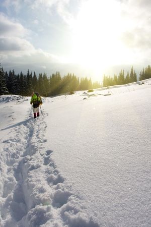 Hiker in winter in mountains
