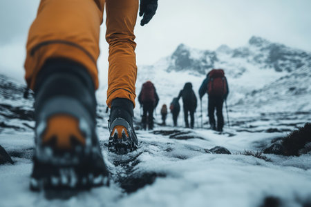 Close-up group of hikers walking through deep snow with majestic mountains in the background, symbolizing adventure, endurance, and nature.