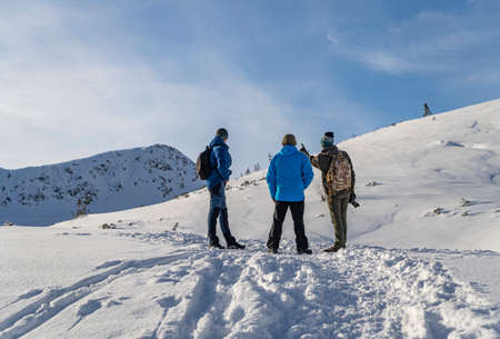 Group of hikers walking in the mountains in winter. Hikers with backpacks