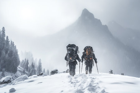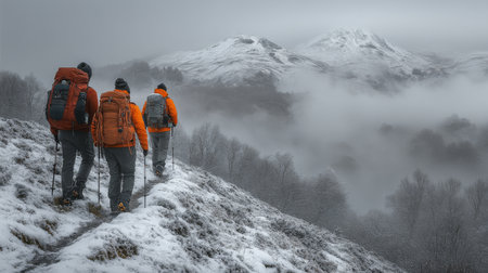 Hikers traverse a snowy path on a foggy mountain trail in winter, surrounded by towering peaks and trees shrouded in mist. Generative AI