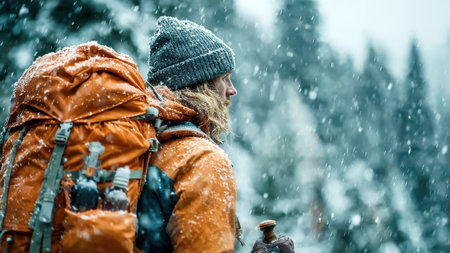 Hiker walking in snowy winter forest with backpack.