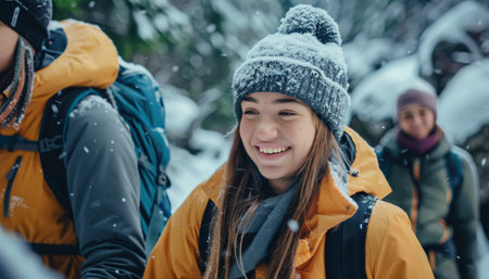 Teenage girl smiling warmly, wearing winter hiking gear during a snowy outdoor adventure.