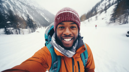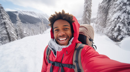 Traveler influencer taking selfie during travel in winter season backpack on alps mountain comeliness