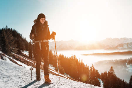 Hiker on the top of a mountain in the winter at sunset