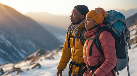 Black couple people hiker in the mountains