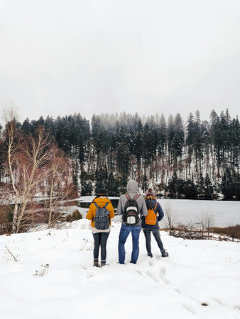 A rearview of friends in sweater and backpack in snow during winter