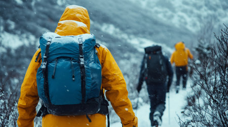 Hikers with backpacks are walking on a snowy mountain trail during a snowfall