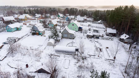 Aerial view of a small village in winter. Rural road passing between snow-covered houses. winter landscape