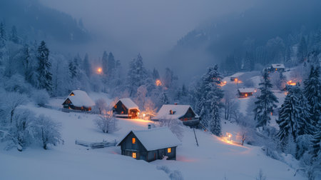 Snow-covered village with cozy cabins illuminated by warm lights in a tranquil winter landscape during twilight. Generative AI
