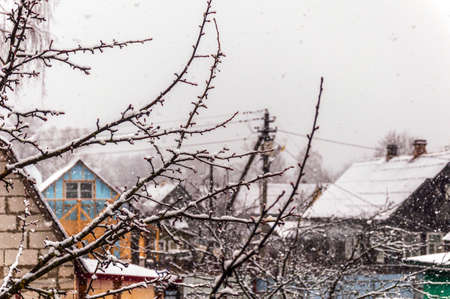 Snowy winter, on the street in the Russian village.