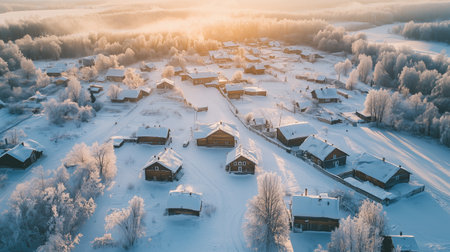Aerial view of a serene winter village at sunrise with snow-covered homes and trees in a tranquil, remote landscape