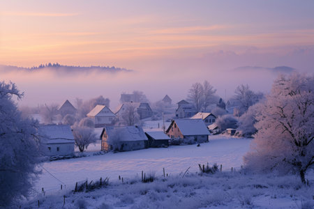 In this photo, a snowy landscape is captured with houses and trees prominently featured in the foreground, A frosty winter sunrise over a sleepy village, AI Generated
