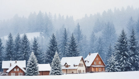 A snowy mountain town with houses and trees covered in snow. The houses are small and cozy, and the snow-covered landscape creates a peaceful and serene atmosphere